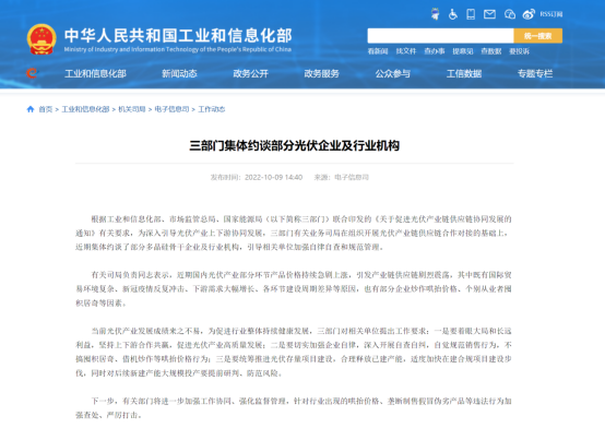 近日,为深入引导光伏产业上下游协同发展,工业和信息化部、市场监管总局、国家能源局(下简称“三部门”)集体约谈了部分多晶硅骨干企业及行业机构,引导相关单位加强自律自查和规范管理。在会上,三部门对参会单位提出要求:一是要着眼大局和长远利益,坚持上下游合作共赢,促进光伏产业高质量发展;二是要切实加强企业自律,深入开展自查自纠,自觉规范销售行为,不搞囤积居奇、借机炒作等哄抬价格行为;三是要统筹推进光伏存量项目建设,合理释放已建产能,适度加快在建合规项目建设步伐,同时对后续新建产能大规模投产要提前研判、防范风险。会上,有关司局负责同志表示,近期国内光伏产业部分环节产品价格持续急剧上涨,引发产业链供应链剧烈震荡,其中既有国际贸易环境复杂、新冠疫情反复冲击、下游需求大幅增长、各环节建设周期差异等原因,也有部分企业炒作哄抬价格、个别从业者囤积居奇等因素。约谈指出,下一步,有关部门将进一步加强工作协同、强化监督管理,针对行业出现的哄抬价格、垄断制售假冒伪劣产品等违法行为加强查处、严厉打击。华夏能源网(公众号hxny3060)注意到,今年以来,硅料价格持续上涨,已创下十年新高。原材料价格持续上涨,传导至硅片与电池片环节,造成了整个行业的价格失衡,严重影响新能源装机和行业健康发展。对此,工信部办公厅、市场监管总局办公厅、国家能源局综合司于8月24日发布了关于促进光伏产业链供应链协同发展的通知,要求:在光伏发电项目开发建设中,不得囤积倒卖电站开发等资源、强制要求配套产业投资、采购本地产品。严厉打击光伏行业领域哄抬价格、垄断、制售假冒伪劣产品等违法违规行为。但是,这并没有止住硅料、硅片涨价,8月31日,硅料年内第29次涨价,单晶致密料价格最高涨至30.8万元/吨,行业人士称硅料和组件价格高位运行态势或将持续到2023年初。价格保障、供需失衡已经成为了光伏行业健康发展的一大“毒瘤”。如今,工信部等三部门直接约谈光伏企业并明确提出要“加强查处、严厉打击”,这有望促使行业早日回归理性、走向正常。