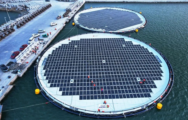 该项目位于山东省海阳市南侧海域,离岸30公里,水深30米。本次建设的500千瓦漂浮式海上光伏由两个环形浮体单元组成,单个浮体单元装机容量250千瓦,由环形抗风浪浮体、耐海洋环境的高强薄膜、光伏系统等组成。在直径53米,面积相当于4个标准篮球场的浮体单元上,共安装了770块光伏组件,其发出的清洁电能汇流到逆变器后送至同场运行的半岛南3号风机平台,后续将通过海上升压站送出至电网。该实证项目验证了浮体、锚固、发电组件抗风浪能力和海洋环境耐候性,验证风光同场并网的技术可行性。