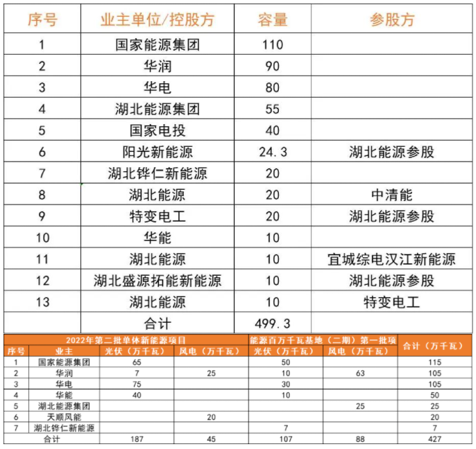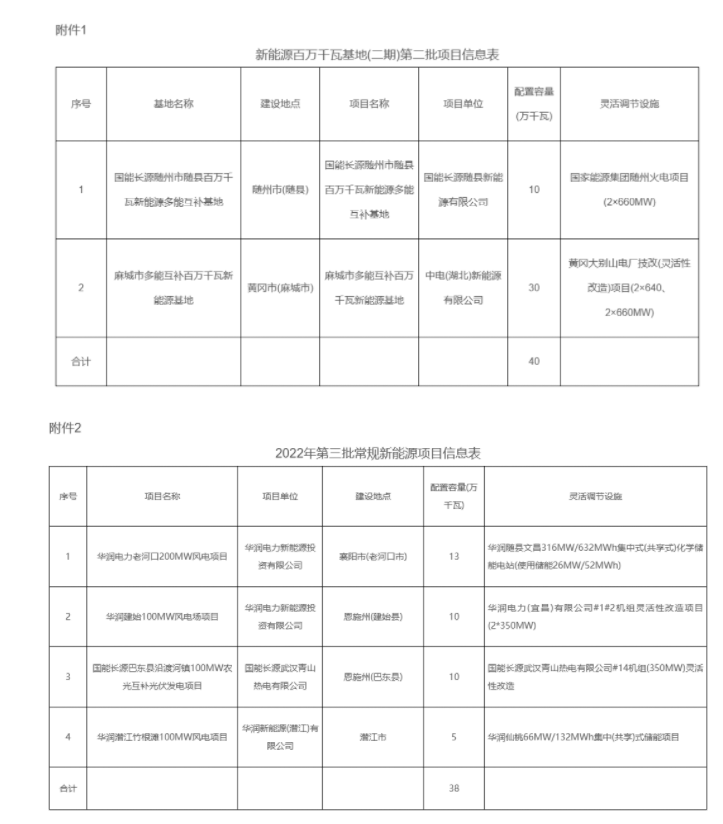 事实上, 自去年9月伊始,湖北已陆续公布2022年三批新能源项目名单。第一批共计4.99GW,风电项目3个、容量30万千瓦(《湖北4.99GW新能源项目名单:湖北能源、国能投、华润、华电领衔》);光伏发电项目29个、容量469.3万千瓦。第二批则包含1.95GW的7个风光火储新能源百万千瓦基地、以及2.32GW的常规风光项目,总计4.27GW(《湖北第二批4.27GW新能源项目名单:国能投、华润、华电超1GW!》)。叠加第三批780MW新能源项目,湖北2022年新能源项目共计下发约10GW。