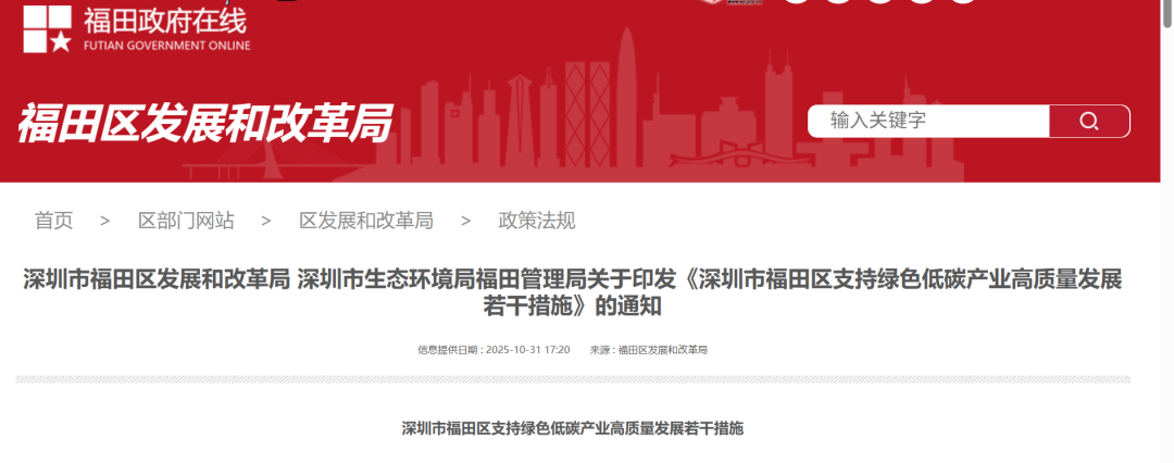 近期,深圳市福田区发展和改革局、深圳市生态环境局福田管理局印发《深圳市福田区支持绿色低碳产业高质量发展若干措施》的通知,通知中提出: